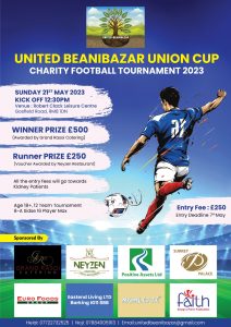 ইউনাইডেট বিয়ানীবাজার কমিউনিউটি এসোসিয়েশন এবারও কিডনী রোগীদের পাশে দাঁড়ানোর উদ্যোগ নিয়েছে।এজন্য ২১ মে আয়োজন করা হয়েছে ফুটবল টুর্নামেন্ট। এই টুর্নামেন্টে স্পন্সর করছে- গ্র্যান্ড রেসই কেটারিং, নেইজিন রেস্টুরেন্ট, পজেটিভ এসেট লিমিটেড, সারে দ্যা প্যালেস, ইউরো ফুড্স, ইষ্ট এন্ড লিভিং লিমিটেড, মামলেট, ফেইথ ডিজাইন এন্ড পাবলিকেশন্স।
