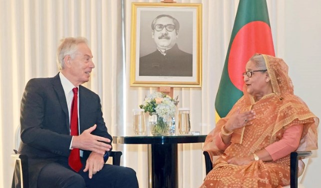 যুক্তরাজ্য সফররত প্রধানমন্ত্রী শেখ হাসিনার সঙ্গে আজ সকালে লন্ডনের ক্ল্যারিজ হোটেলের সভা কক্ষে সাবেক ব্রিটিশ প্রধানমন্ত্রী টনি ব্লেয়ার সৌজন্য সাক্ষাৎ করেন।